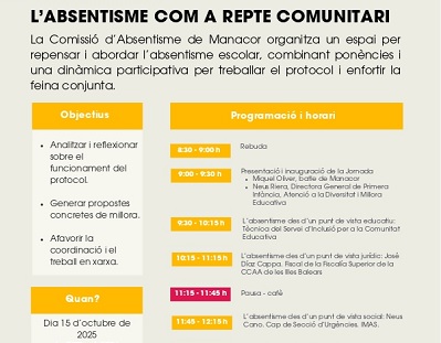 - L’Ajuntament de Manacor organitza la jornada “L’absentisme com a repte comunitari”, que se celebrarà el dimecres 15 d’octubre, de 9 a 14 h, al Conservatori de Música (carrer de sa Fàbrica, 2)