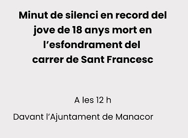 - Pésame institucional. El Ayuntamiento de Manacor expresa sus más profundas condolencias por la trágica pérdida de un joven de 18 años a raíz del derrumbe de su vivienda en la c/Sant Francesc esta madrugada