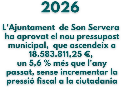 COMUNICADO: Presupuesto aprobado de 2026. El Ayuntamiento de Son Servera ha aprobado el nuevo presupuesto municipal, que asciende a 18.583.811 €, un 5,6% más que el año pasado, sin incrementar la presión fiscal a la ciudadanía. Continuamos la legislatura fieles a nuestro compromiso: una gestión rigurosa, responsable y equilibrada que optimiza cada recurso para garantizar servicios públicos de calidad.